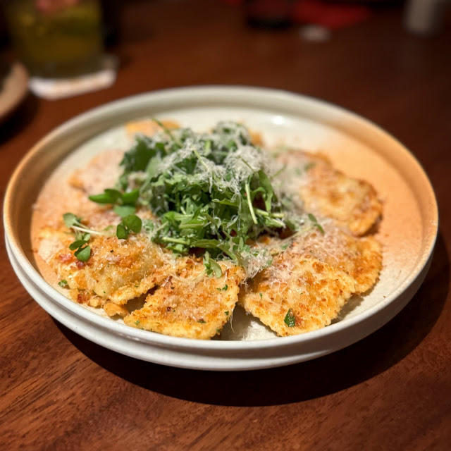 接下來這牛肝菌雲吞$168就非常合我口味,菌香滿溢的意大利雲吞很有咬口,中央配上了香滑的茄子醬和濃郁火箭菜,加上香口蒜片的加持真的叫我回味不已。