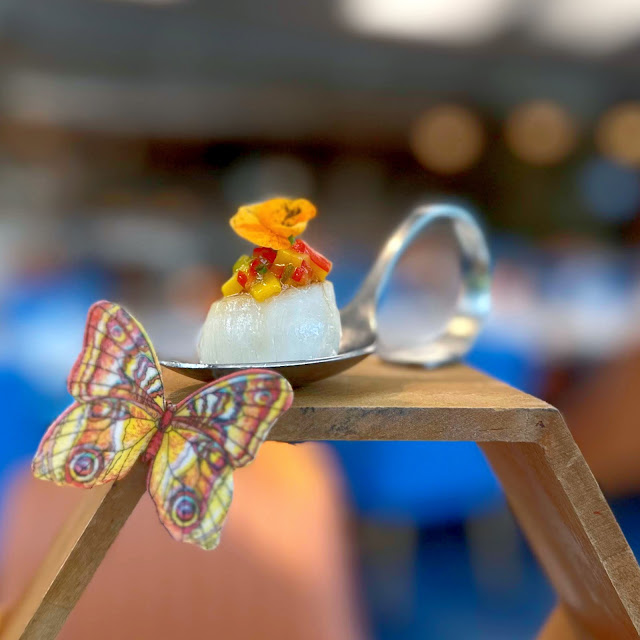 先品嚐海鮮點心香煎帶子配蜜糖芒果莎莎,香軟的鮮甜帶子上綴以果香十足的芒果莎莎,吃下不油不膩味道清新怡人。